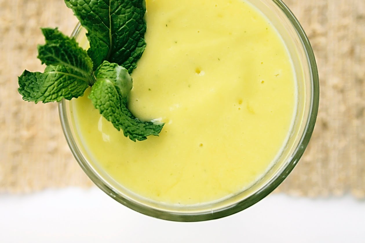 Combine avocado, mango, coconut milk, mango juice and mint into a blender and blend until smooth.